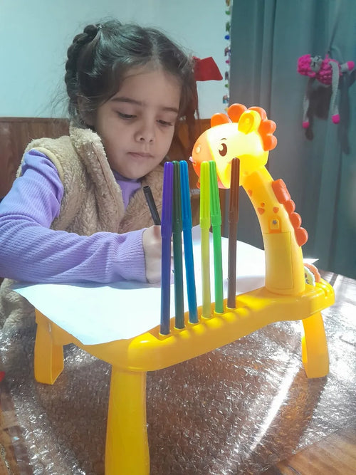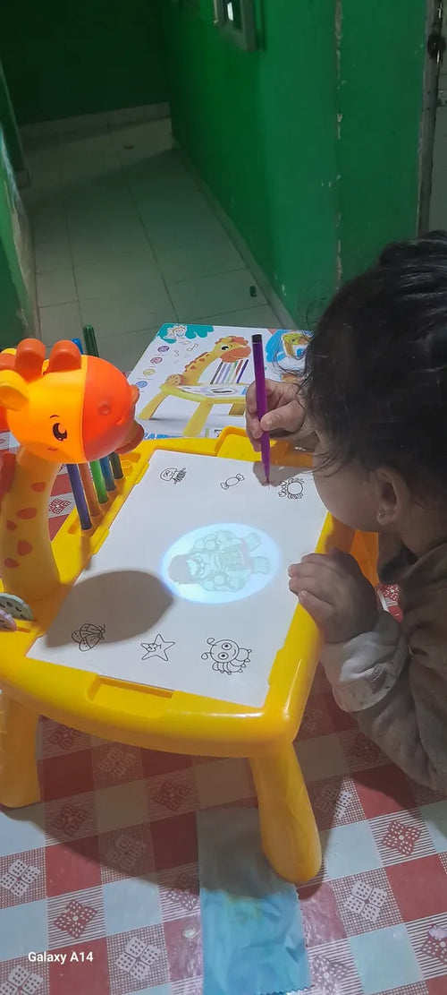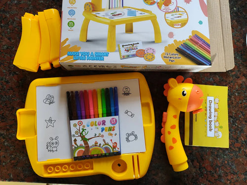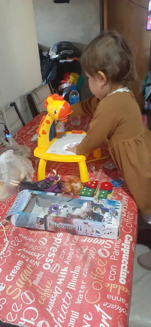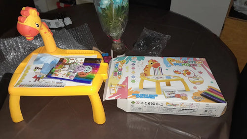 La verdad que por el precio no le tenia tanta fe pero me sorprendió gratamente. Lleva 3 pilas, muy buena la luz del proyector se ve super nítido. Tiene varios discos con imágenes para proyectar. Trajo hojitas y fibras, la verdad super completo y parece resistente. Me olvidaba tiene musiquita q va cambiando sola y podes quitarle las dos patas delanteras y queda inclinada la mesita o bien le sacas las 4 y queda como para poner sobre la mesa.
