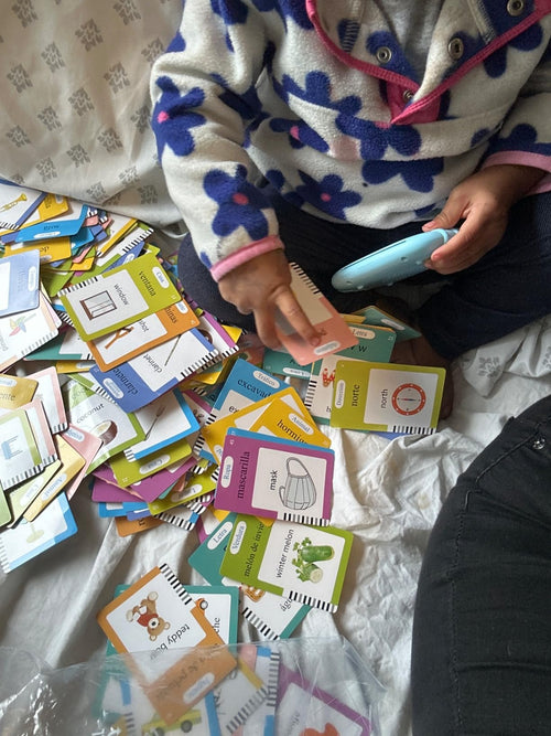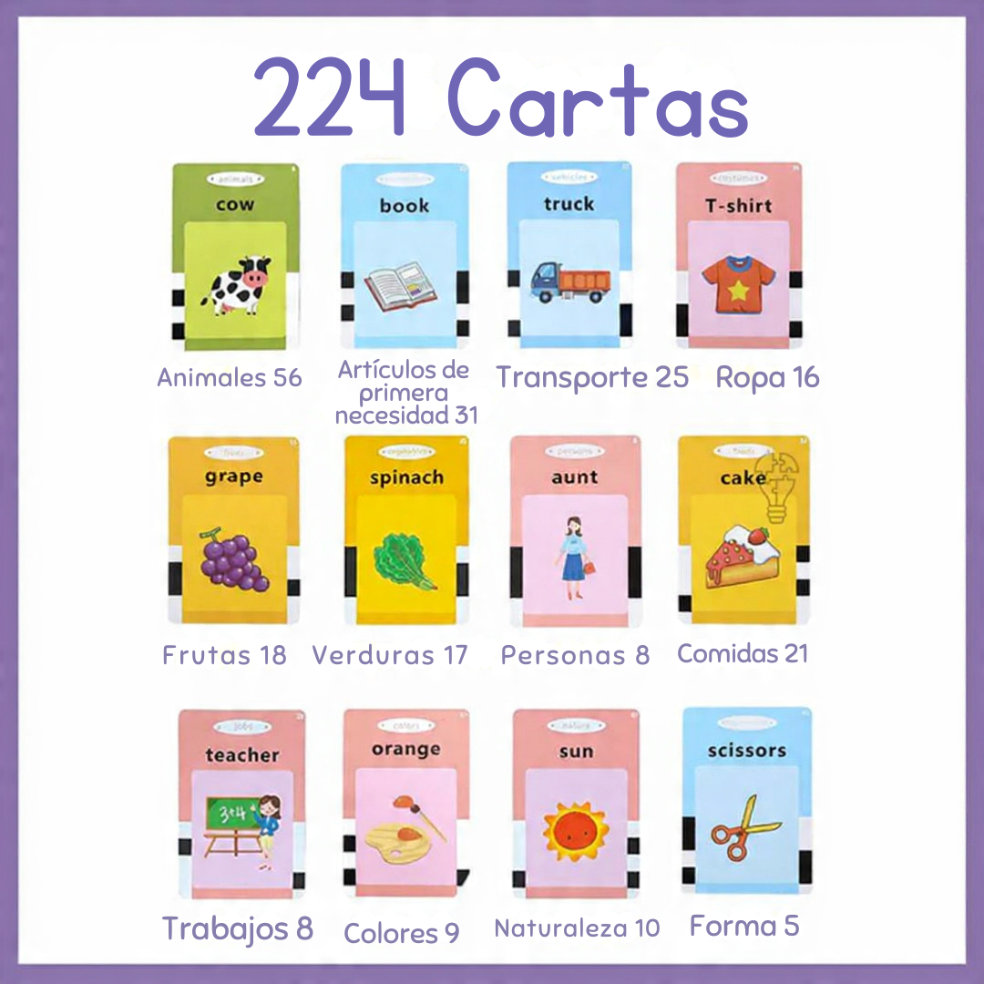 Las tarjetas incluyen palabras de objetos cotidianos con los que los chicos interactúan todos los días: frutas, animales, objetos, vehículos, colores y mucho más. Todo pensado para que aprendan vocabulario real y útil desde temprano.