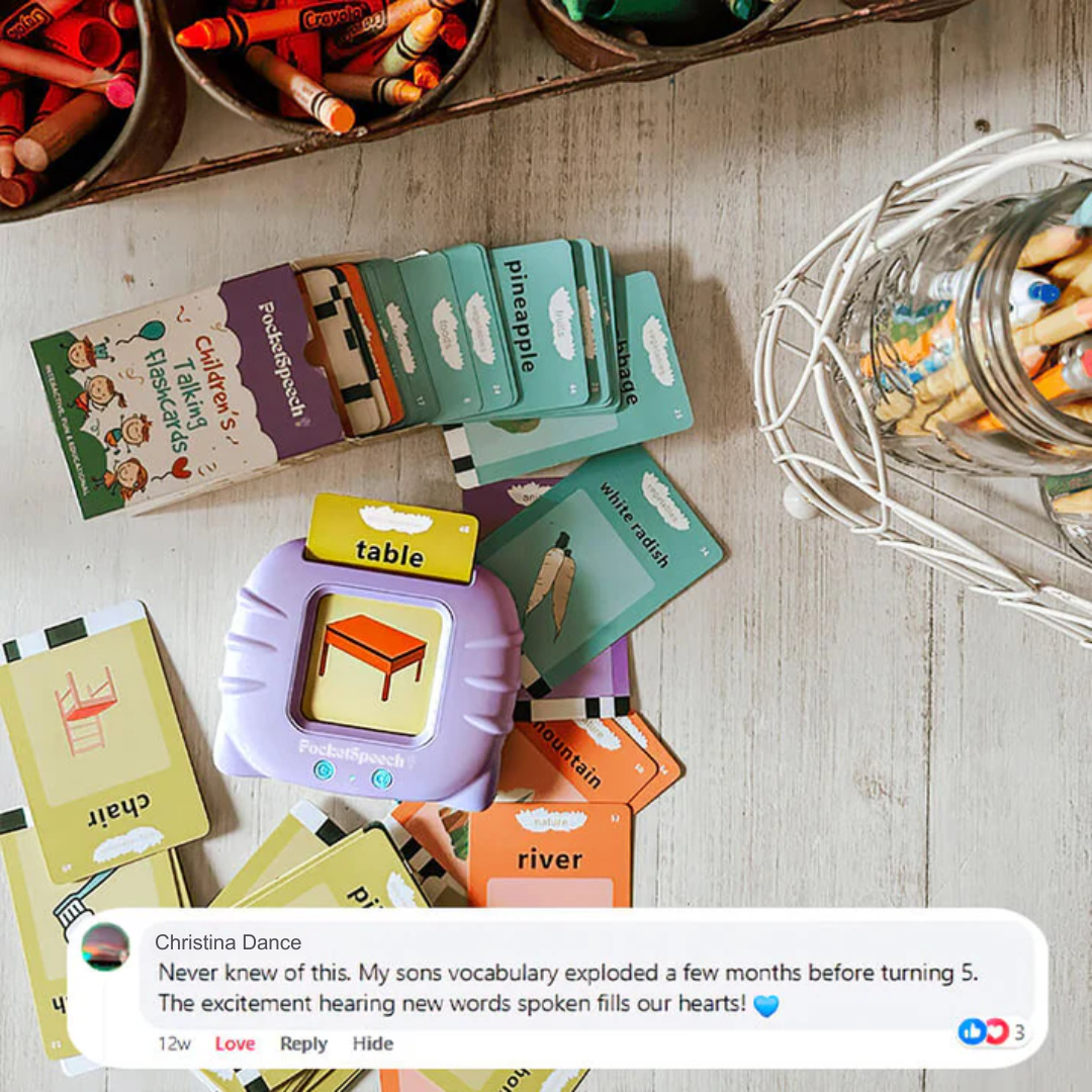Lo compré como regalo de Navidad para mi hijo de 3 años, que viene teniendo demoras en el habla. Estamos viendo un progreso enorme con el PocketSpeech, y ayuda muchísimo que él está obsesionado con jugar todo el día y repetir las palabras.