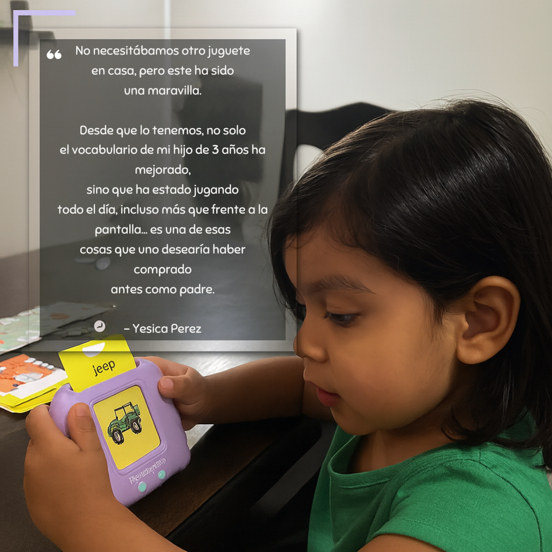 Mi hija de 2 años lo ama. Es una herramienta increíble para ayudar a desarrollar el lenguaje y el conocimiento de palabras en los más chiquitos. El lector de tarjetas se adapta perfecto a sus manitos y hace que aprender nuevas palabras sea una experiencia súper interactiva.